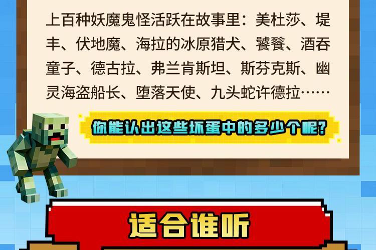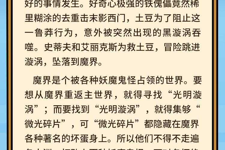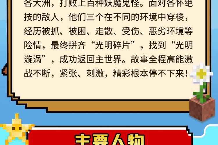 糟糕!最近主世界发生了一件怪事:末影西门突然不断的闪烁蓝光,人们都说会有不好的事情发生。好奇心极强的铁傀儡竟然稀里糊涂的去重击末影西门,土豆为了阻止这一鲁莽行为,意外被突然出现的黑漩涡吞噬。史蒂夫和艾丽克斯为救土豆,冒险跳进漩涡,坠落到魔界。 魔界是个被各种妖魔鬼怪占领的世界。要想从魔界重返主世界,就得寻找“光明漩涡”;而要找到“光明漩涡”,就得集够“微光碎片”,可“微光碎片”都隐藏在魔界各种著名的坏蛋身上。所以他们不得不走遍各大洲,打败上百种妖魔鬼怪。面对各怀绝技的敌人,他们三个在不同的环境中穿梭,经历被抓、被困、走散、受伤、恶劣环境等险情,最终拼齐“光明碎片”,找到“光明漩涡”,成功返回主世界。故事全程高能激战不断,紧张、刺激,精彩根本停不下来!