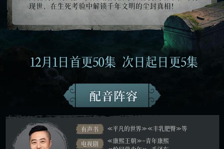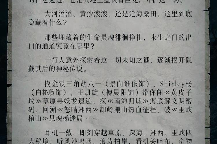 生死轮回的千古之迷,,消逝的千百年文明,尘封的古老遗迹,苍茫大地上盘伏着巨龙,守护这一切。 大河滔滔、黄沙滚滚,还是沧海桑田,这里到底隐藏着什么? 那些埋藏着的生命灵魂徘徊挣扎,永生之门的出口的通道究竟在哪里? 一行人意外探索着这一切未知之谜,逐渐揭开隐藏其后的神秘传说。 摸金铁三角胡八一(景向谁依饰)、Shirley 杨(白杺瓒饰)、王凯旋(傅晨阳饰)带你闯《黄皮子坟》草原寻妖龙遗迹、探《南海归墟》海底解文明密码、回溯《怒晴湘西》卸岭搬山热血征程、破《巫峡棺山》悬魂梯迷局…… 耳机一戴,即刻穿越草原、深海、湘西、巫峡四大秘境,听风沙呜咽、浪涛拍岸,看机关暗布、奇物现世,在生死考验中解锁千年文明的尘封真相!