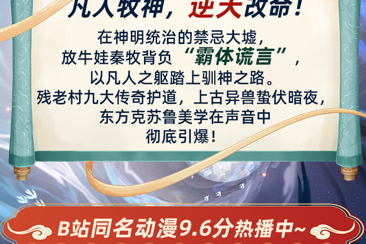【动漫原著】【东方玄幻】【起点大作】拆神骨铺通天道,教凡人牧尽苍天! 凡人牧神,逆天改命!在神明统治的禁忌大墟,放牛娃秦牧背负“霸体谎言”,以凡人之躯踏上驯神之路。 残老村九大传奇护道,上古异兽蛰伏暗夜,东方克苏鲁美学在声音中彻底引爆!