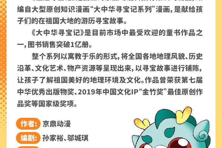 《大中华寻宝记》系列创作公司为上海京鼎动漫科技有限公司,是国内顶尖动漫内容创作公司,被国家文化部评为国家动漫企业,旗下内容品牌包括“漫画中国”系列、《大中华寻宝记》系列、《植物大战僵尸》、《熊出没》等耳熟能详的一线动漫作品。