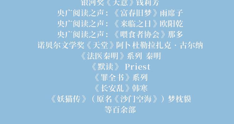 骆驼,有声小说制作人,配音导演。 2011年毕业于南京传媒学院(原中国传媒大学南广学院),曾就职于湖南人民广播节目金鹰之声。2012年开始从事有声书的演播,制作,版权开发等相关工作。作品全网点击量超过5亿次。喜马拉雅平台粉丝量180万。 代表作作品: 《法医秦明》系列、《古董局中局》系列、《默读》、《罪全书(十宗罪)》系列、《武则天》系列等。 2011年入选《中国当代主持人》杂志 2016年荣获沈阳都市广播沈阳都市广播“优秀演播者” 2017年演播作品《妖猫传》荣获当当阅读“金耳朵”奖 2020年荣获京东阅读“最受欢迎主播奖”