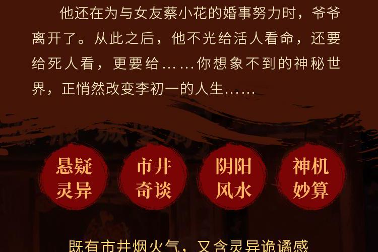 李初一与爷爷在小县城开寿衣店,爷爷曾是“神相”,因过往阴影发誓不再为人算卦,只私下传他相术,教了他一身算命的本事。 他还在为与女友蔡小花的婚事努力时,爷爷离开了。从此之后,他不光给活人看命,还要给死人看,更要给……你想象不到的神秘世界,正悄然改变李初一的人生。等你一起探秘灵异事件!