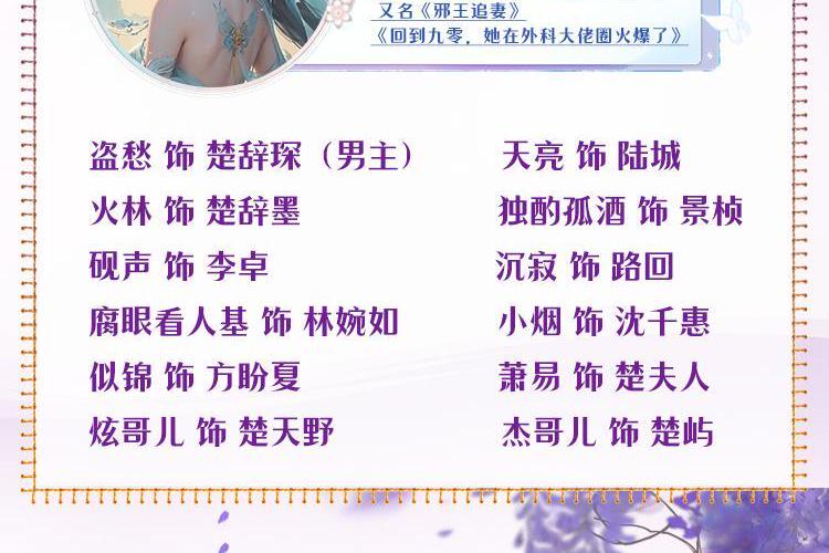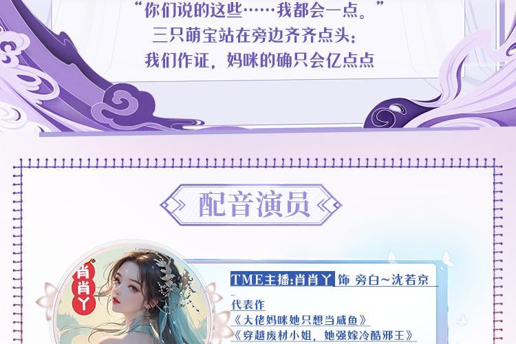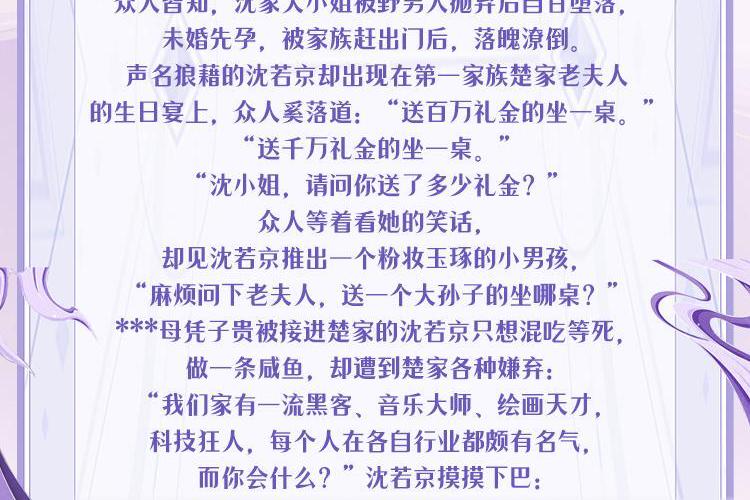众人皆知,沈家大小姐被野男人抛弃后自甘堕落,未婚先孕,被家族赶出门后,落魄潦倒。声名狼藉的沈若京却出现在第一家族楚家老夫人的生日宴上,众人奚落道:“送百万礼金的坐一桌。”“送千万礼金的坐一桌。”“沈小姐,请问你送了多少礼金?”众人等着看她的笑话,却见沈若京推出一个粉妆玉琢的小男孩,“麻烦问下老夫人,送一个大孙子的坐哪桌?”***母凭子贵被接进楚家的沈若京只想混吃等死,做一条咸鱼,却遭到楚家各种嫌弃:“我们家有一流黑客、音乐大师、绘画天才,科技狂人,每个人在各自行业都颇有名气,而你会什么?”沈若京摸摸下巴:“你们说的这些……我都会一点。”三只萌宝站在旁边齐齐点头:我们作证,妈咪的确只会亿点点 职员表: 肖肖丫 饰 旁白~沈若京 盗愁 饰 楚辞琛 天亮 饰 陆城 火林 饰 楚辞墨 独酌孤酒 饰 京桢 砚声 饰 李卓 沉寂 饰 路回 腐眼看人基 饰 林婉如 小烟 饰 沈千惠 似锦 饰 方盼夏 萧易 饰 楚夫人 炫哥儿 饰 楚天野 杰哥儿 饰 楚屿