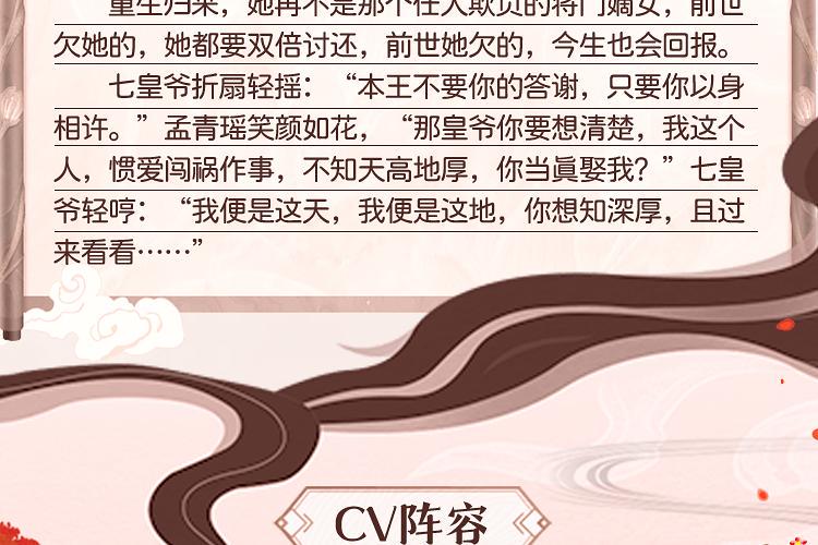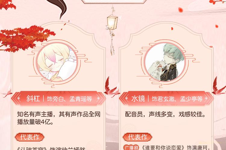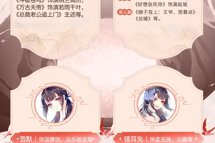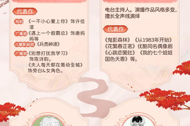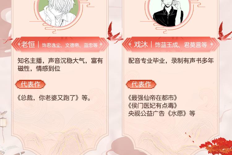 【斜杠】 饰 旁白 孟青瑶 苏燕回 徐氏等 【水镜】 饰 君玄澈 孟少亭等 【雪默】 饰 蓝景悦 云乐郡主等 【锤耳兔】 饰 孟玉珠 云裳等 【老恒】 饰 君逸尘 文德帝 蓝忠等 【戏沐】 饰 蓝玉成 君莫言等