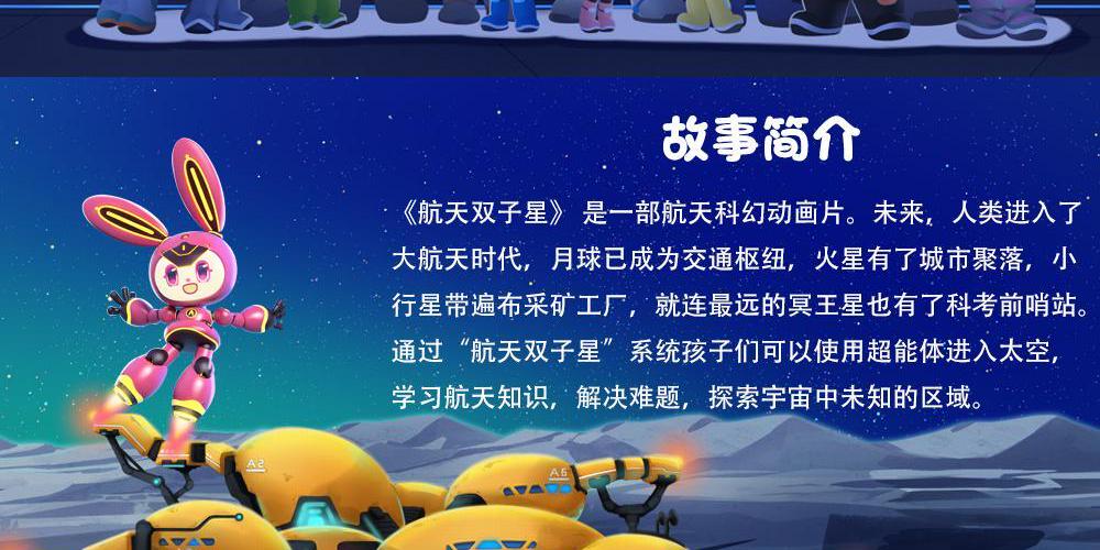 《航天双子星》是一部航天科幻动画片。在未来,人类进入了大航天时代,月球已成为交通枢纽,火星有了城市聚落,小行星带遍布采矿工厂,就连最远的冥王星也有了科考前哨站。在广袤的宇宙中,每一次人类的建设都是对未知的勇敢挑战。当挑战过程中遇到困难,不必慌张,因为“双子星小队”时刻准备为您护航。只需一声召唤,航天双子星即刻启程,每位成员都将施展独特本领,团结协作、克服困难,完成任务的同时探索宇宙。