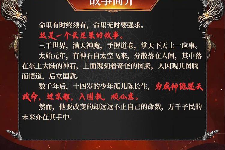 少年陈长生带着一纸婚书来到京都,为了改变活不过二十岁的命运刻苦修炼,最终发现自己就是别人的一颗棋子但幸运地改变了命运,最终成为了教宗并收获了爱情。 命里有时终须有,命里无时要强求。 这是一个长生果的故事。 三千世界,满天神魔,手握道卷,掌天下天上一应事。 太始元年,有神石自太空飞来,分散落在人间,其中落在东土大陆的神石,上面镌刻着奇怪的图腾,人因观其图腾而悟道,后立国教。 数千年后,十四岁的少年孤儿陈长生,为成神隐逆天改命,进京都,入国教,顺心意。然而,他要改变的却远远不止自己的命数,万千子民的未来亦在其手中。