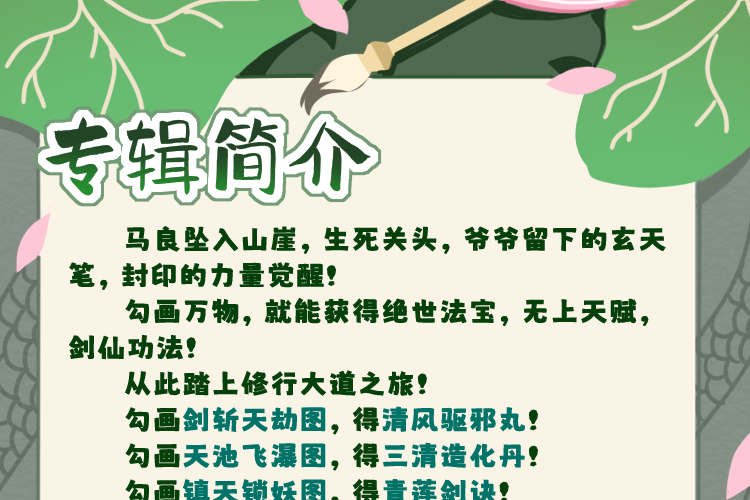马良坠入山崖,生死关头,爷爷留下的玄天笔,封印的力量觉醒! 勾画万物,就能获得绝世法宝,无上天赋,剑仙功法! 从此踏上修行大道之旅! 勾画剑斩天劫图,得清风驱邪丸! 勾画天池飞瀑图,得三清造化丹! 勾画镇天锁妖图,得青莲剑诀! 勾画琼楼玉宇图,得昊天无上鼎! ...... 那些被抢走的东西,马良要一件一件夺回来! 行侠仗义,除魔卫道!御剑乘风,气凌霄汉! 那一日,魔教来袭,宗门大危,却有一少年手持长剑,傲然挺立于天地! 妖王?魔头?一剑而斩之! 龙马花雪毛,金鞍五陵豪! 秋霜切玉剑,落日明珠袍!