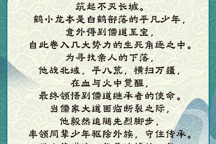 这是一个以儒道为基的修炼世界,有教无类,人人皆可成圣。 海洋族入侵中土大地,为守护家园,一代代儒道修士抛头颅,洒热血,筑起不灭长城。 鹤小龙本是白鹤部落的平凡少年,意外得到儒道至宝,自此卷入几大势力的生死角逐之中。 为寻找亲人的下落,他战北域,平八荒,横扫万疆,在血与火中觉醒,最终领悟到儒道继承者的使命。 当儒家大道面临断裂之际,他毅然追随先烈脚步,率领同辈少年驱除外族,守住传承。 世人皆道这一代是垮掉的一代,却不知中土少年人人如龙,为往圣继绝学,为万世开太平。 鹤小龙:“我有一愿,惟愿我中土儒道重新屹立于世界之巅!”