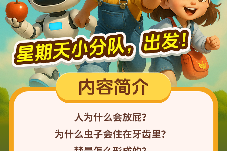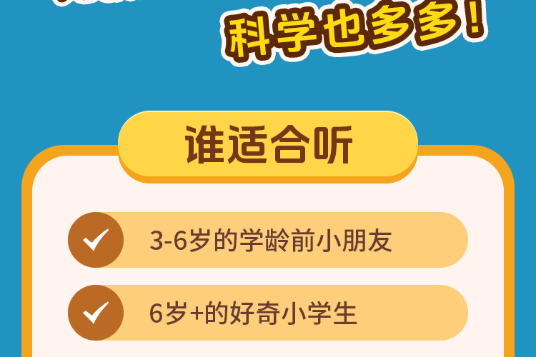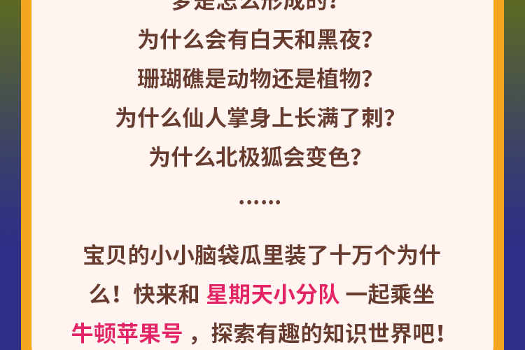《儿歌多多十万问》是由儿歌多多团队为3岁以上宝贝打造的科普情景广播剧!跟着活泼好奇的星期天小分队成员,乘坐神奇的牛顿苹果号开启知识冒险吧——从会变魔术的北极狐皮毛到仙人掌的防身刺铠甲,从牙齿里的小虫谜团到珊瑚礁的动物身份卡,用童趣儿歌和趣味剧情解开孩子心中的"十万个为什么"。每天3分钟,让宝宝在哈哈大笑中认识世界,培养观察力与想象力!快戴上小耳机,和小天、小星、小七一起发现更多大自然的奇妙秘密!