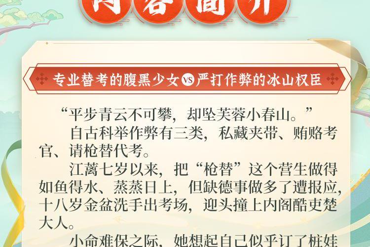 “平步青云不可攀,却坠芙蓉小春山。” 自古科举作弊有三类,私藏夹带、贿赂考官、请枪替代考。 江蓠七岁以来,把“枪替”这个营生做得如鱼得水、蒸蒸日上,但缺德事做多了遭报应,十八岁金盆洗手出考场,迎头撞上内阁酷吏楚大人。