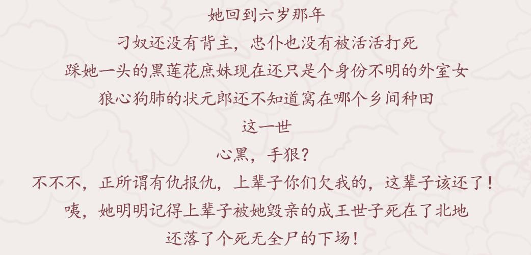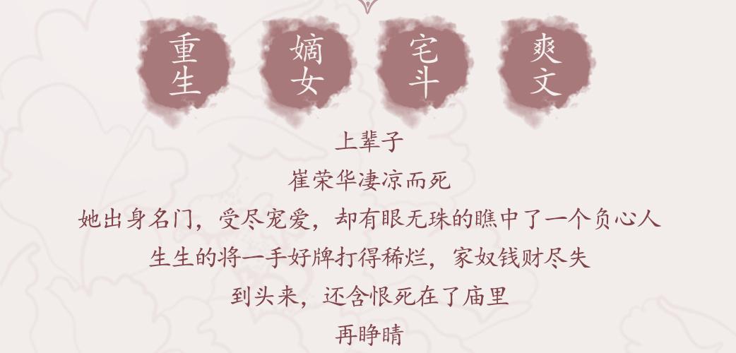 上辈子,崔荣华凄凉而死。她出身名门,受尽宠爱,却有眼无珠的瞧中了一个负心人,生生的将一手好牌打得稀烂,家奴钱财尽失,到头来,还含恨死在了庙里。