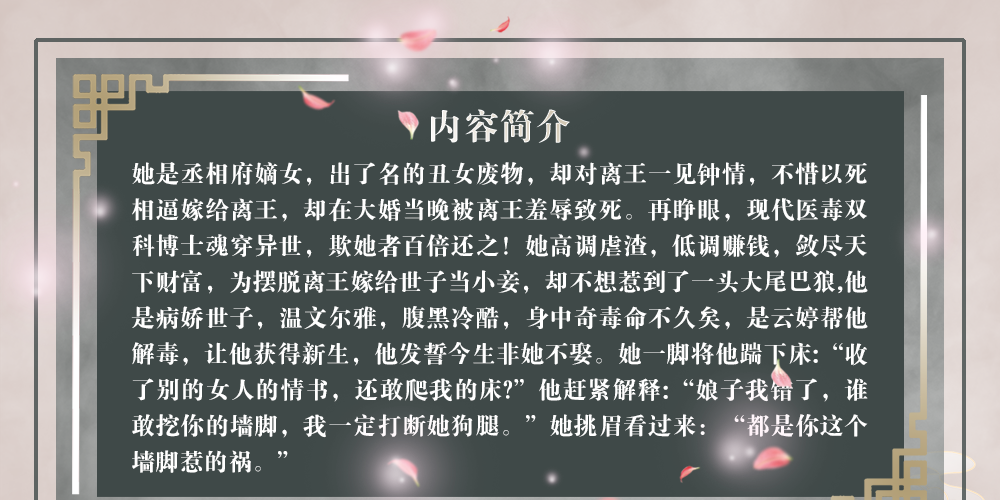 她是丞相府嫡女,出了名的丑女废物,却对离王一见钟情,不惜以死相逼嫁给离王,却在大婚当晚被离王羞辱致死。 再睁眼,现代医毒双科博士魂穿异世,欺她者百倍还之! 她高调虐渣,低调赚钱,敛尽天下财富,为摆脱离王嫁给世子当小妾,却不想惹到了一头大尾巴狼。 他是病娇世子,温文尔雅,腹黑冷酷,身中奇毒命不久矣,是云婷帮他解毒,让他获得新生,他发誓今生非她不娶。 她一脚将他踹下床:“收了别的女人的情书,还敢爬我的床?” 他赶紧解释:“娘子我错了,谁敢挖你的墙脚,我一定打断她狗腿。” 她挑眉看过来:“都是你这个墙脚惹的祸。”