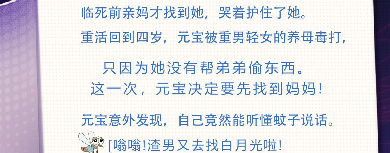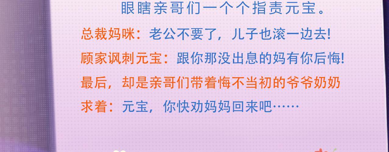 元宝本是豪门小千金,流落在外只活到八岁就惨死了。 重生回到四岁,元宝决定这一次要先找到亲妈…… 被污蔑偷东西,元宝据理力争却被毒打,元宝含泪隐忍。 被喝醉的养父剁手,元宝拼命自救,濒死之际总裁亲妈赶到,养父母才知元宝是豪门小千金,后悔不迭!