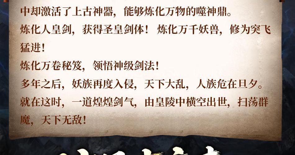 林煜贵为大汉王朝皇子,遭人陷害,南征惨败,修为被废,被罚看守皇陵,永世不得翻身。 然而他在皇陵中却激活了上古神器,能够炼化万物的噬神鼎。 炼化人皇剑,获得圣皇剑体! 炼化万千妖兽,修为突飞猛进! 炼化万卷秘笈,领悟神级剑法!多年之后,妖族再度入侵,天下大乱,人族危在旦夕。 就在这时,一道煌煌剑气,由皇陵中横空出世,扫荡群魔,天下无敌!
