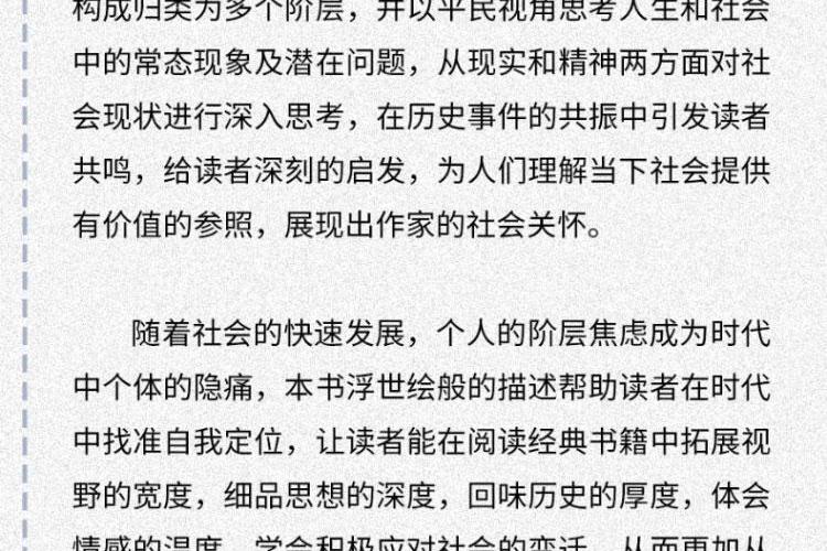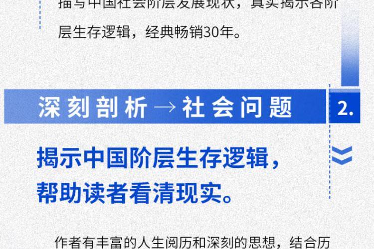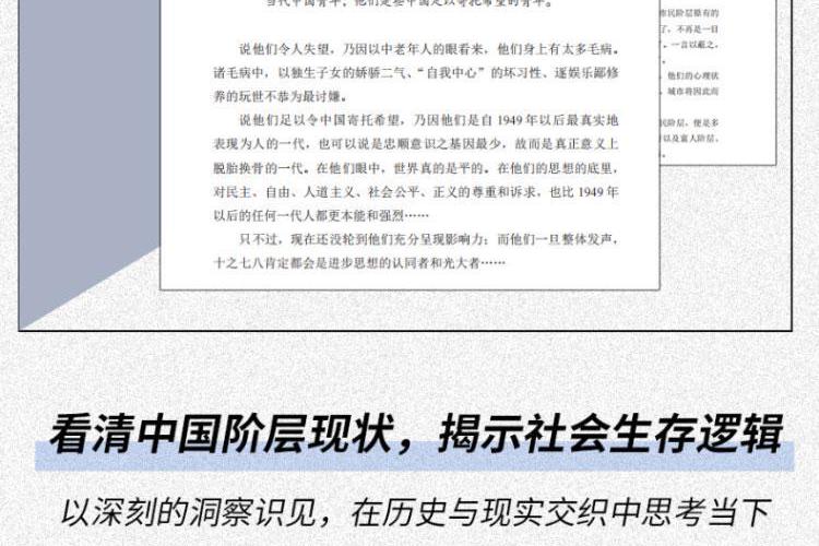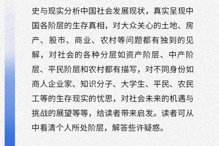 茅奖获得者、《人世间》作者梁晓声一版再版,影响深远的经典作品。书中陈述的是多年前的国情,但多年前的事情正是当下社会种种事端和问题的源头。本书如同一面镜子,映照出辉煌与阴影的两面;这是一部透视社会生存真相的“显微镜”,让你看清社会运行的逻辑本质。本书几乎让我们可以对号入座找到各自的位置,让你在认清现实后,找到清醒前行的力量。 作者以犀利的笔触,将中国社会划分为九大阶层——从手握资本的“当代资产者”“买办者”,到挣扎于房价与生活的“中产者”“城市平民”,再到常被忽视的农民、农民工群体,甚至触及“黑社会”“灰社会”等隐秘角落。