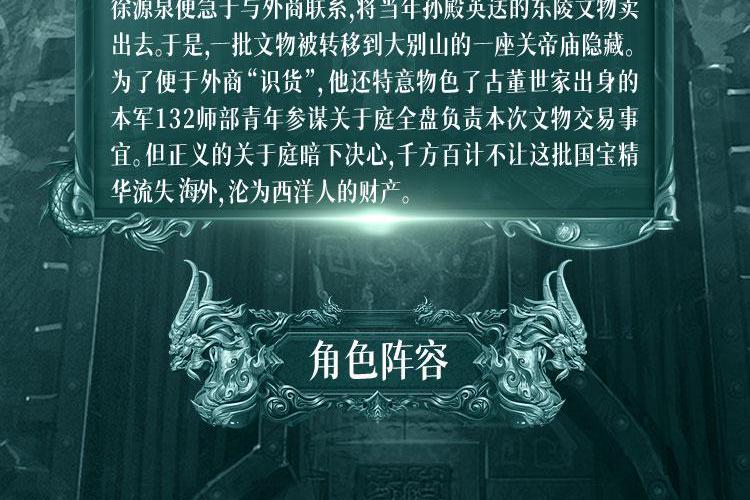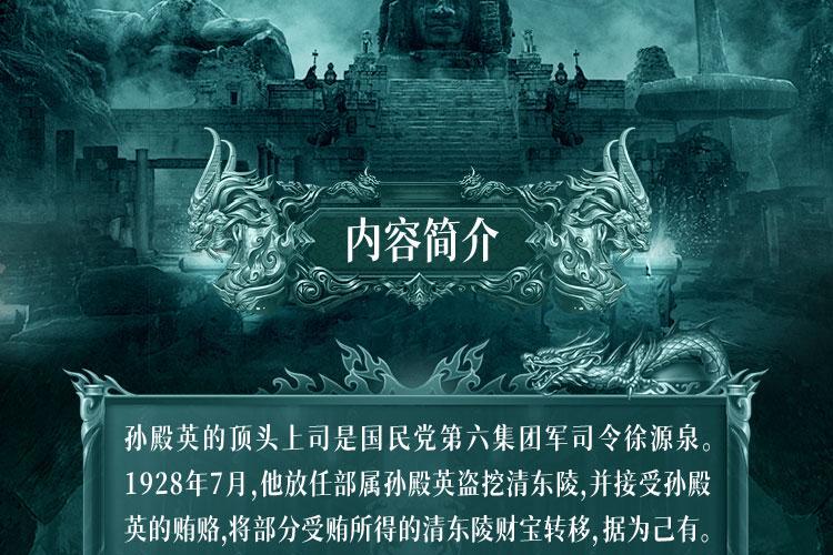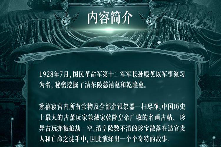 1928年7月,国民革命军第十二军军长孙殿英以军事演习为名,秘密挖掘了清东陵慈禧墓和乾隆墓。慈禧寝宫内所有宝物及全部金银祭器一扫尽净,中国历史上最大的古董玩家兼藏家乾隆皇帝广收的名画古帖、珍异古玩亦被抢劫一空。清皇陵数不清的珍宝散落在达官贵人和亡命之徒手中,因此演绎出一个个奇特的故事。 特别声明:本书根据原有历史事件进行了部分改编演绎,不完全为历史事实!