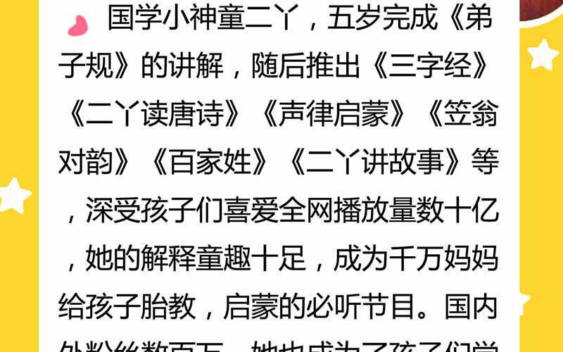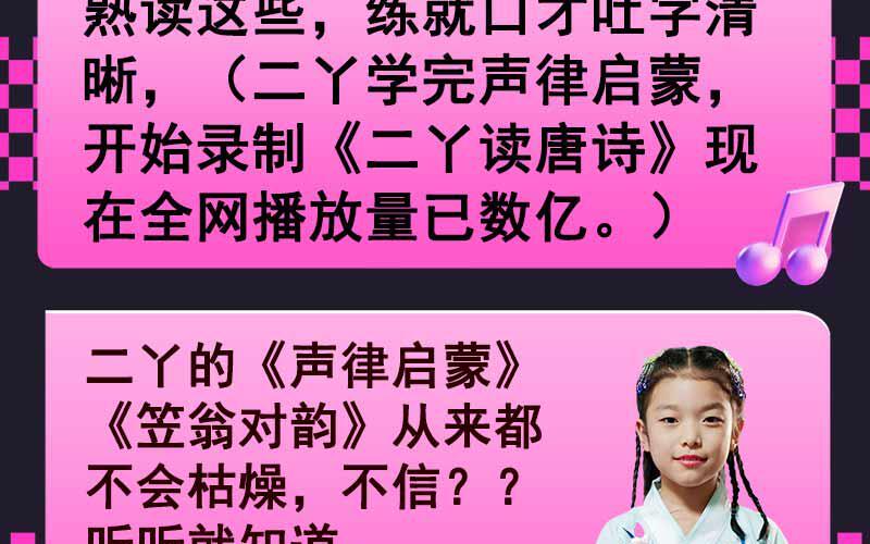 从小接受国学启蒙的二丫,希望把所学的道理用到行动中去通过不懈的努力让更多的孩子都能从中受益。二丫现在的节目有《三字经》《百家姓》《弟子规》《唐诗三百首》《声律启蒙》《笠翁对韵》《二丫讲故事》,后续二丫还会推出更多的节目,希望大家喜欢。领读 跟读 儿童版 和二丫一起来读声律启蒙吧。。。。。