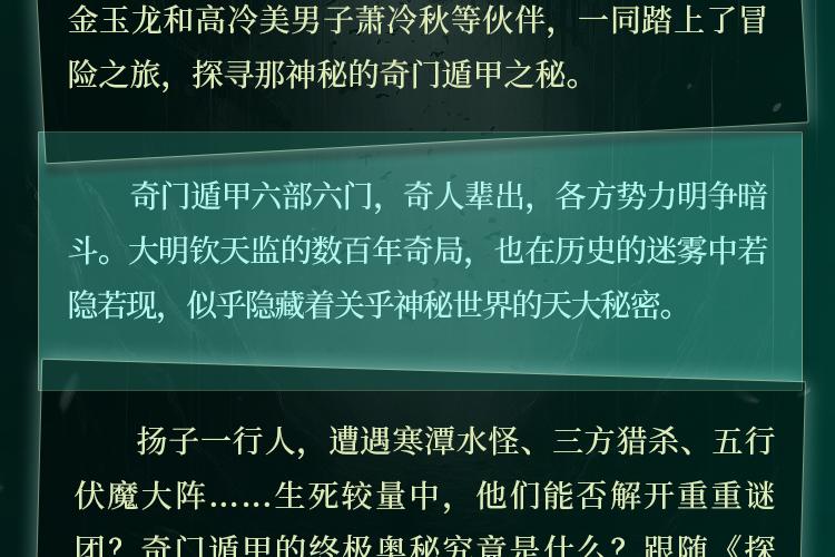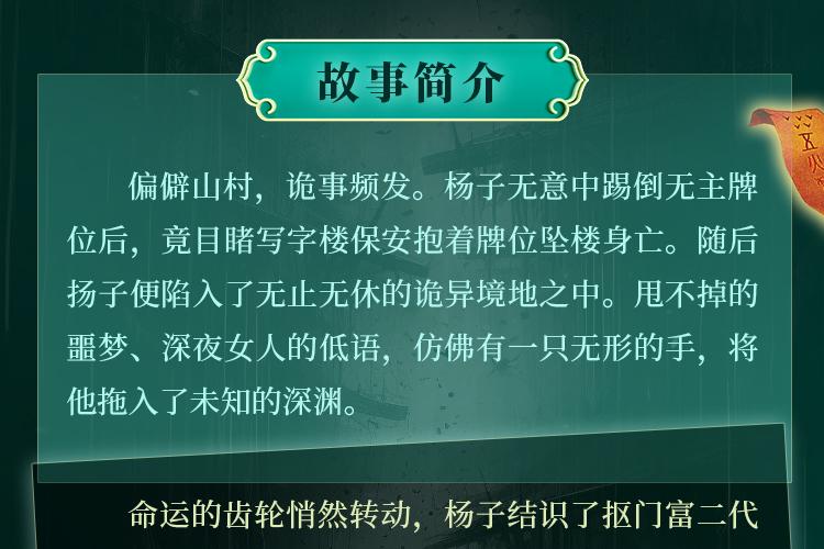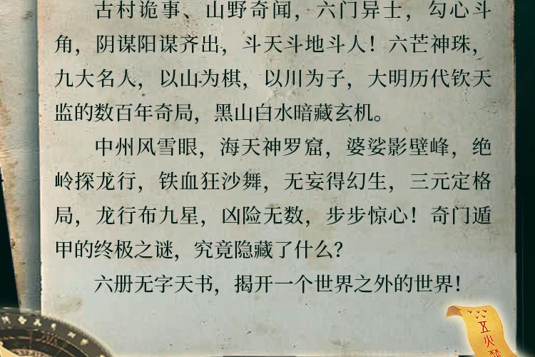 偏僻山村,诡事频发。杨子无意中踢倒无主牌位后,竟目睹写字楼保安抱着牌位坠楼身亡。随后扬子便陷入了无止无休的诡异境地之中。甩不掉的噩梦、深夜女人的低语,佛有一只无形的手,将他拖入了未知的深渊。 命运的齿轮悄然转动,杨子结识了抠门富二代金玉龙和高冷美男子萧冷秋等伙伴,一同踏上了冒险之旅,探寻那神秘的奇门遁甲之秘。 奇门遁甲六部六门,奇人辈出,各方势力明争暗斗。大明钦天监的数百年奇局,也在历史的迷雾中若隐若现,似乎隐藏着关乎神秘世界的天大秘密。 扬子一行人遍布名山大川,遭遇寒潭水怪、三方猎杀、五行伏魔大阵……生死较量中,他们能否解开重重谜团?奇门遁甲的终极奥秘究竟是什么? 科学的尽头是玄学,玄学之精髓尽在奇门遁甲,奇门遁甲六部六门,阴阳、五行、天干地支、八卦九宫、甲子、节气,包罗万象,更隐藏着一个天大的秘密! 古村诡事、山野奇闻,六门异士,勾心斗角,阴谋阳谋齐出,斗天斗地斗人!六芒神珠,九大名人,以山为棋,以川为子,大明历代钦天监的数百年奇局,黑山白水暗藏玄机。 中州风雪眼,海天神罗窟,婆娑影壁峰,绝岭探龙行,铁血狂沙舞,无妄得幻生,三元定格局,龙行布九星,凶险无数,步步惊心!奇门遁甲的终极之谜,究竟隐藏了什么? 六册无字天书,揭开一个世界之外的世界!