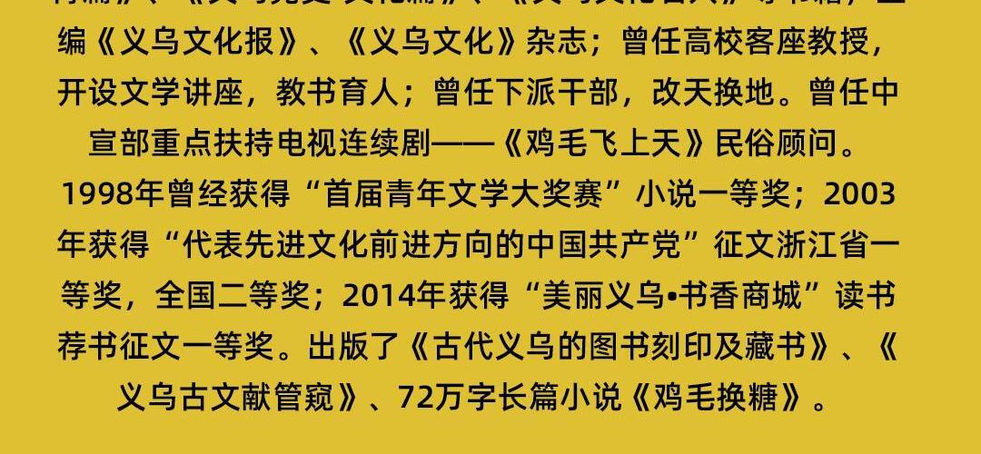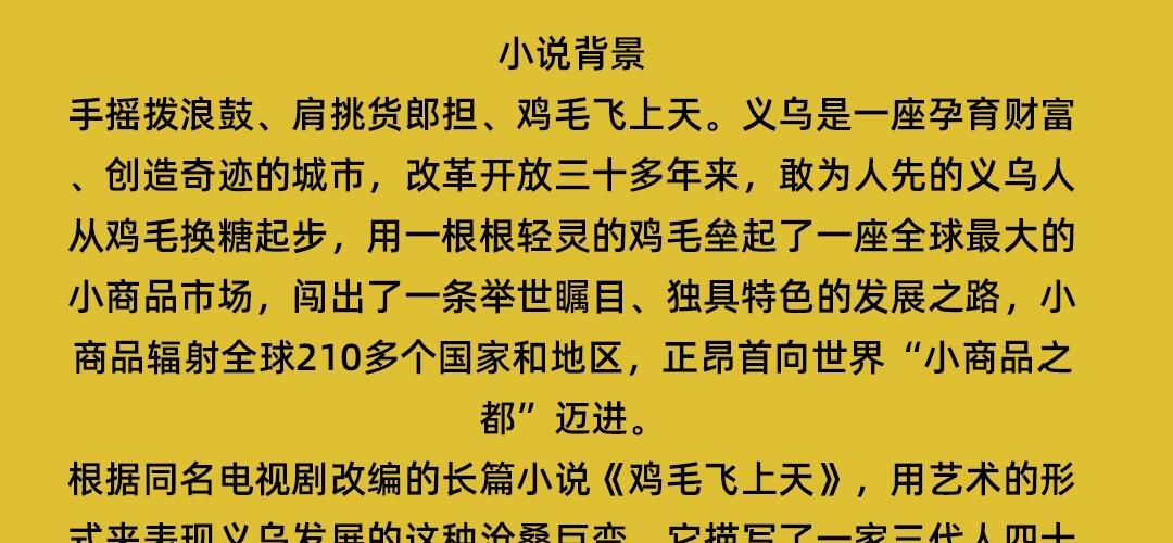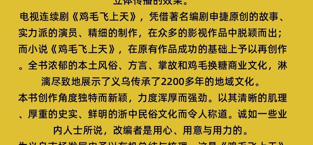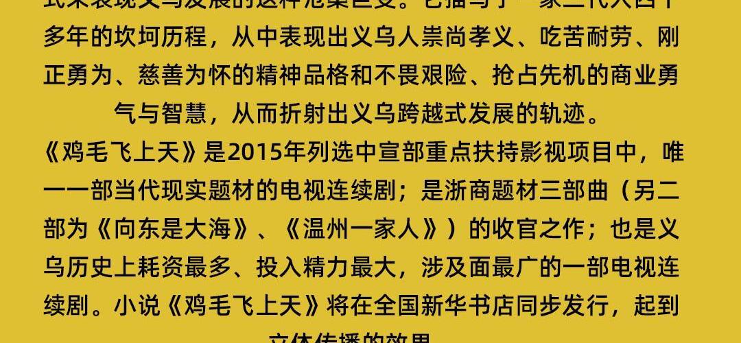 经典电视剧《鸡毛飞上天》同名小说。 以陈江河和妻子骆玉珠的感情和创业故事为线索,讲述了义乌改革发展30多年曲折而又辉煌的历程。