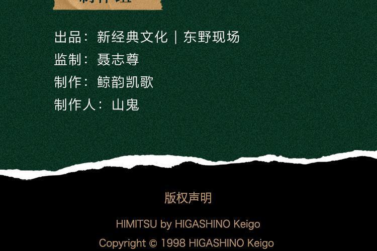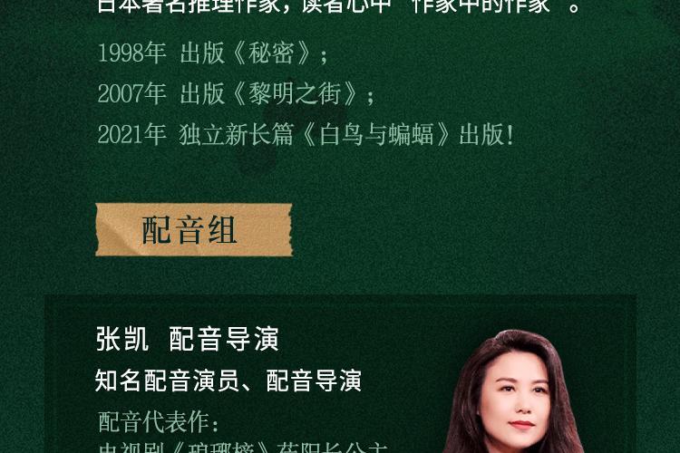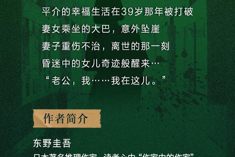 平介的幸福生活在39岁那年被打破 妻女乘坐的大巴,意外坠崖 妻子重伤不治,离世的那一刻 昏迷中的女儿奇迹般醒来… “老公,我……我在这儿 作者简介 东野圭吾,日本著名推理作家,读者心中“作家中的作家”。 1998年 出版《秘密》; 2007年 出版《黎明之街》; 2021年 独立新长篇《白鸟与蝙蝠》出版!