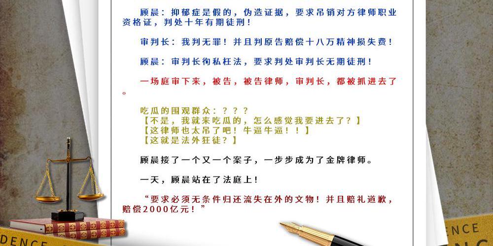 穿越到蓝星,顾晨成为了一名实习律师。 刚开了一家律所,就接到了一个案子,【地铁被污蔑偷拍案】,两个女生污蔑别人绝不认错,还要写小作文网暴别人。 被告律师:小仙女没错! 顾晨:小仙女造谣,污蔑,网暴他人,造成严重影响,要求判处七年有期徒刑! 被告律师:小仙女玉玉了,精神有问题,无罪! 顾晨:抑郁症是假的,伪造证据,要求吊销对方律师职业资格证,判处十年有期徒刑! 审判长:我判无罪!并且判原告赔偿十八万精神损失费! 顾晨:审判长徇私枉法,要求判处审判长无期徒刑! 一场庭审下来,被告,被搞律师,审判长,都被抓进去了。 吃瓜的围观群众:??? 【不是,我就来吃瓜的,怎么感觉我要进去了?】 【这律师也太吊了吧!牛逼牛逼!!】 【这就是法外狂徒?】 顾晨接了一个又一个案子,一步步成为了金牌律师。 一天,顾晨站在了法庭上! “要求必须无条件归还流失在外的文物!并且赔礼道歉,赔偿2000亿元!”