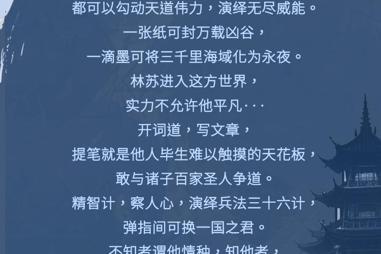 这是一个文采风流却又杀机四伏的世界。 美妙的诗词歌赋、琴棋书画,都可以勾动天道伟力,演绎无尽威能。 一张纸可封万载凶谷,一滴墨可将三千里海域化为永夜。 林苏进入这方世界,实力不允许他平凡··· 开词道,写文章,提笔就是他人毕生难以触摸的天花板,敢与诸子百家圣人争道。 精智计,察人心,演绎兵法三十六计,弹指间可换一国之君。 不知者谓他情种,知他者,言他为真性情。