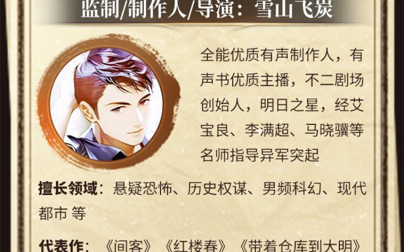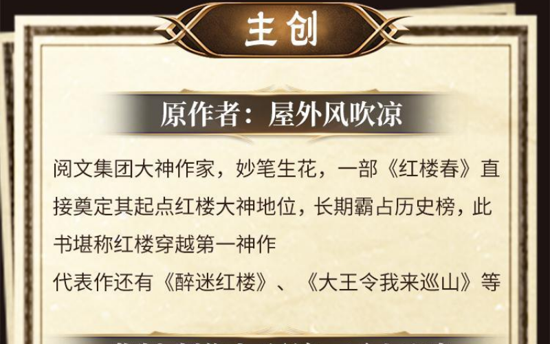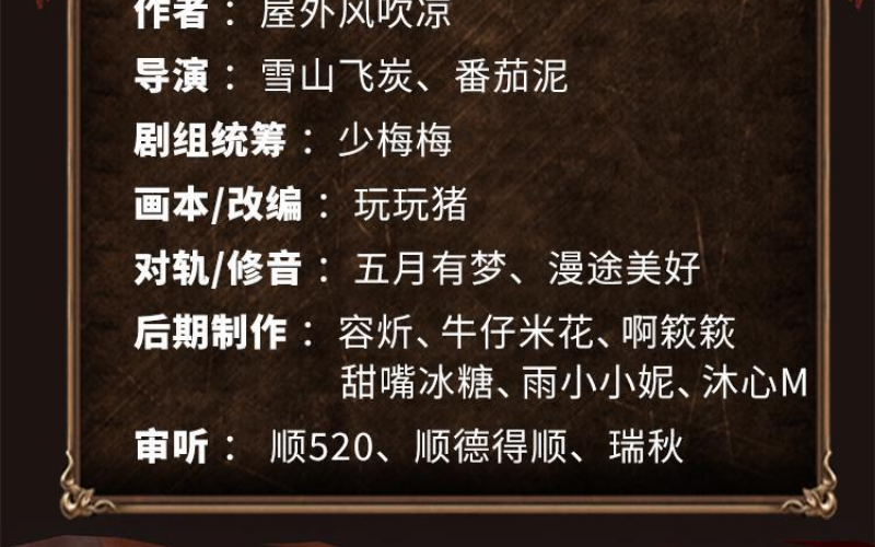 主创:原作者:屋外风吹凉阅文集团大神作家,妙笔生花,一部《红楼春》直接奠定其起点红楼大神地位,长期霸占历史榜,此书堪称红楼穿越第一神作,代表作还有《醉迷红楼》、《大王令我来巡山》等 监制、制作人、导演:雪山飞炭全能优质有声制作人,有声书优质主播,不二剧场创始人,明日之星,经艾宝良、李满超、马晓骥等名师指导异军突起,擅长领域:悬疑恐怖、历史权谋、男频科幻、现代都市等