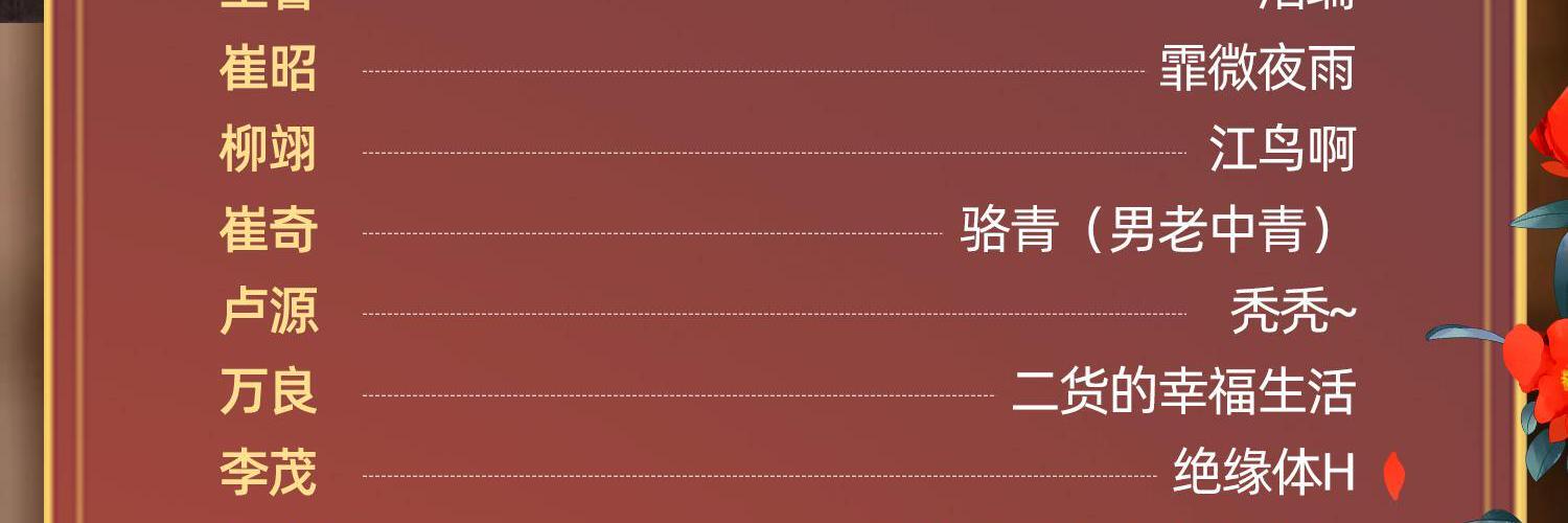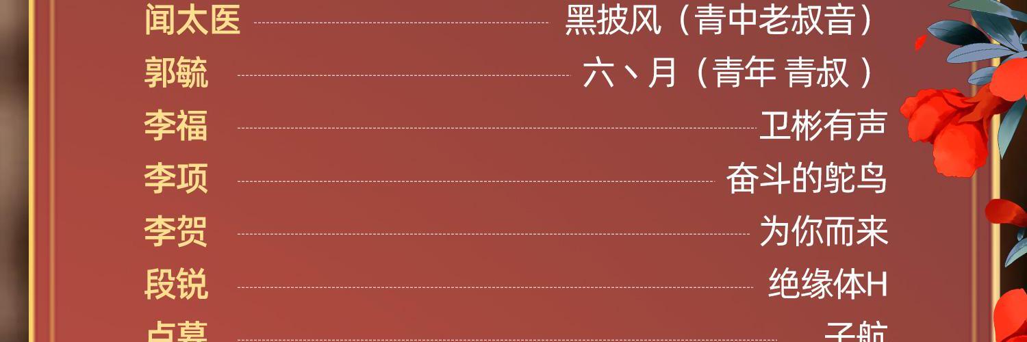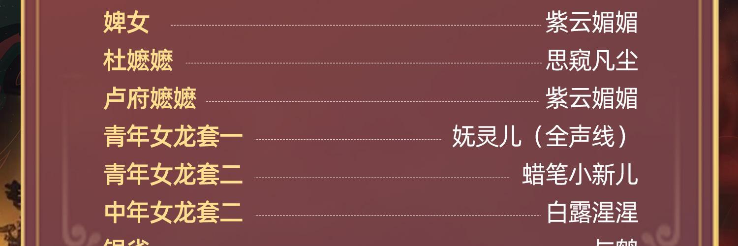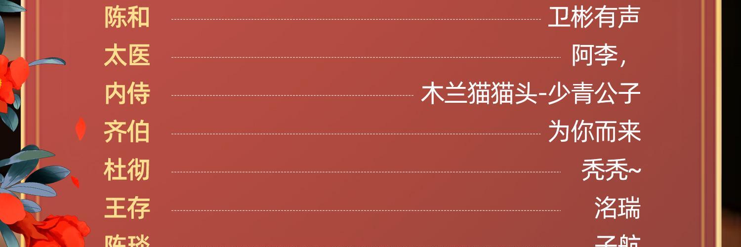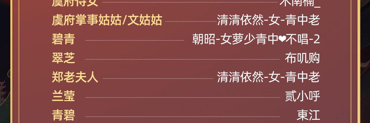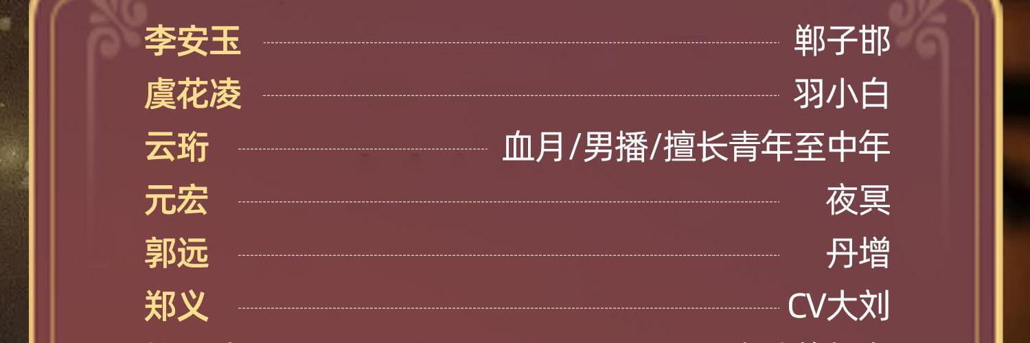 配音演员:影视作品《风起洛阳》《苍兰诀》《显微镜下的大明》《光荣与梦想》《夺冠》《冰糖炖雪梨》等 有声:《似锦》《韶光慢》《一品仵作》《玉无香》《逢春》等