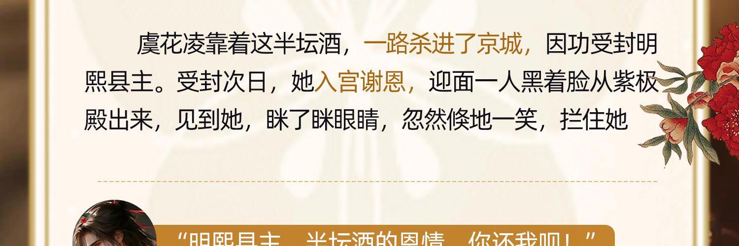 太和元年春,料峭寒夜,虞花凌浑身是血,虚软无力地靠在深巷一角,觉得这人生真是操蛋,千里追杀,她怕是进不了京就得死在路上。 糟心昏沉之际,一人拎着酒从旁边酒肆出来,瞧见她,顿住,隔着三丈的距离,看了片刻,啧啧一声,“好好的一个小姑娘,怎么这么惨?我这里有半坛酒,要吗?” 虞花凌厌厌地掀起眼皮,盯着这人看了一会儿,长身玉立的一位公子哥,她伸手,“要!” 这人将半坛酒扔给她,转身走了。 虞花凌靠着这半坛酒,一路杀进了京城,因功受封明熙县主。 受封次日,她入宫谢恩,迎面一人黑着脸从紫极殿出来,见到她,眯了眯眼睛,忽然倏地一笑,拦住她,“明熙县主,半坛酒的恩情,你还我呗!” 虞花凌默然看他,很是意外,“怎么还?” 这人开心地说:“你去跟太皇太后说,我,你要了。” 虞花凌:“……” ———————————— 一曲凌霄花上枝,春风十里青云路。—虞花凌 少年春衫薄微雨,寒霜覆雪花盛开。—李安玉