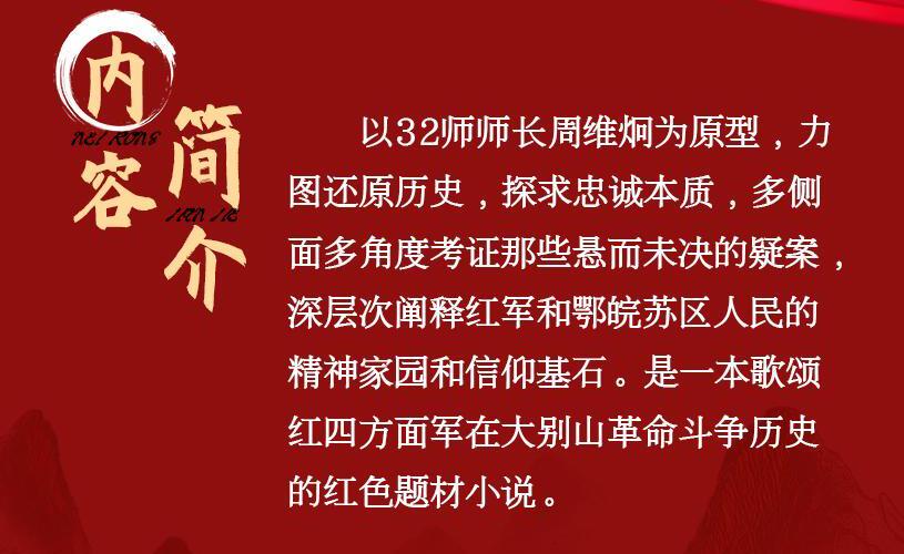 【内容简介】 以32师师长周维炯为原型,力图还原历史,探求忠诚本质,多侧面多角度考证那些悬而未决的疑案,深层次阐释红军和鄂皖苏区人民的精神家园和信仰基石。是一本歌颂红四方面军在大别山革命斗争历史的红色题材小说。 【作者简介】 沈靖,国内知名畅销书作家,作品《玉穷》《八月桂花遍地开》先后获得“五个一”优秀作品奖。小说《女镇长》被誉为描写官场女性最经典作品。 【制作团队】 出品:阅米文化 作者:沈靖 画本:柒禾禾 审听:咪小兔 美工:玉尔 演播:厉朵儿、MOMO墨雪君、化风雨、博山炼、心笙