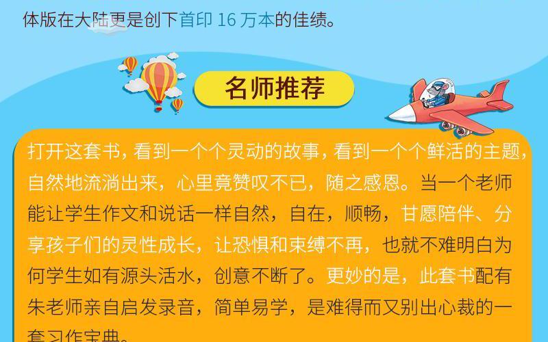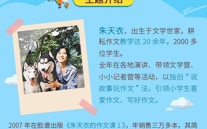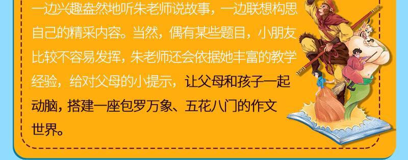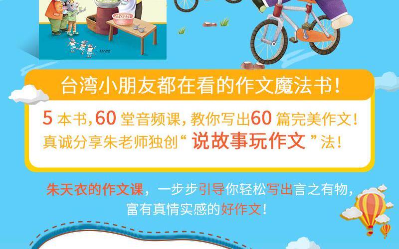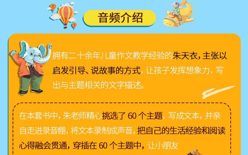"拥有二十余年儿童作文教学经验的朱天衣,主张以启发引导、说故事的方式,让孩子发挥想象力,写出与主题相关的文字描述。她认为,最重要的是让孩子觉得写作文是一件快乐的事。 在本套书中,朱老师精心挑选了12个主题,写成文本,并亲自走进录音棚,将文本录制成声音,把自己的生活经验和阅读心得融会贯通,穿插在12个主题中,让小朋友一边兴趣盎然地听朱老师说故事,一边联想构思自己的精采内容。当然,偶有某些题目,小朋友比较不容易发挥,朱老师还会依据她丰富的教学经验,给对父母的小提示,让父母和孩子一起动脑,搭建一座包罗万象、五花八门的作文世界。"