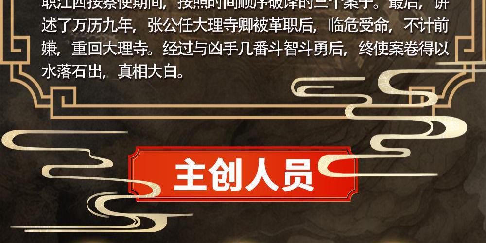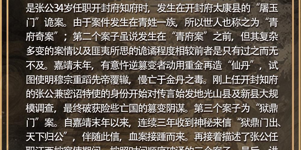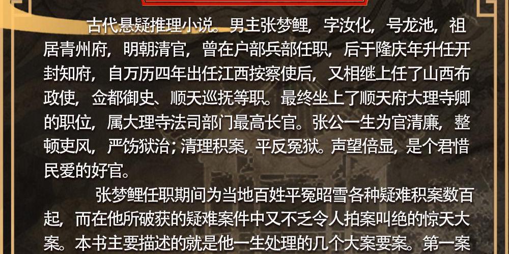 男主张梦鲤,字汝化,号龙池,祖居青州府,明朝清官,曾在户部兵部任职,后于隆庆年升任开封知府,自万历四年出任江西按察使后,又相继上任了山西布政使,佥都御史、顺天巡抚等职。 最终坐上了顺天府大理寺卿的职位,属大理寺法司部门最高长官。张公一生为官清廉,整顿吏风,严饬狱治;清理积案,平反冤狱。声望倍显,是个君惜民爱的好官。 本书主要描述的是张梦鲤一生处理的几个大案要案。第一案是张公34岁任职开封府知府时,发生在开封府太康县的“屠玉门”诡案。由于案件发生在青姓一族,所以世人也称之为"青府奇案”;第二个案子虽说发生在“青府案”之前,但其复杂多变的案情以及匪夷所思的诡谲程度相较前者是只有过之而无不及。嘉靖末年,有意忤逆篡变者动用重金再造“仙丹”,试图使明穆宗重蹈先帝覆辙,慢亡于金丹之毒。刚上任开封知府的张公兼密诏特使的身份开始对传言始发地光山县及新县大规模调查,最终破获险些亡国的篡变阴谋。第三个案子为“狱鼎门”案。自嘉靖末年以来,连续三年收到神秘来信“狱鼎门出、天下归公”,伴随此信,血案接踵而来。再接着描述了张公任职江西按察使期间,按照时间顺序破译的三个案子。最后,讲述了万历九年,张公任大理寺卿被
