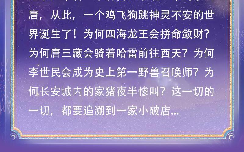 楚小凡带着“卡牌商人系统”来到了大唐,从此,一个鸡飞狗跳神灵不安的世界诞生了!为何四海龙王会拼命敛财?为何唐三藏会骑着哈雷前往西天?为何李世民会成为史上第一野兽召唤师?为何长安城内的家猪夜半惨叫?这一切的一切,都要追溯到一家小破店..