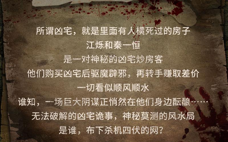 所谓凶宅,就是里面曾经有人横死过的房子。传说这样死去的人因为阳寿并没有过完,所以会死得很不甘心。通常会阴魂不散,所以多数的凶宅一般都会有怪事发生。 江烁和秦一恒是一对神秘的炒房客,他们低价购买远近闻名的凶宅,经过驱鬼辟邪之后,再转手把房子卖出去,每一次都能大赚一笔,生意出奇地好。 不料,这对黄金搭档却被不明来路的人盯上。神秘的炒房合作者六指、“不是人”的合作者袁阵纷至沓来,各种凶险无比的凶宅不断出现,他们发现自己已经很难搞定,几次濒临死亡线。此时,他们发现,自己被套进一张杀机四伏的网内。
