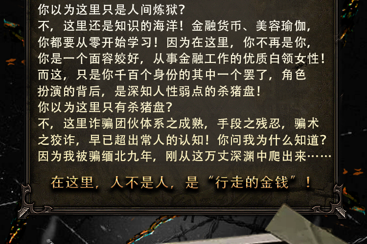 你以为缅北是遍地黄金,能躺着挣钱的天堂? 不,这里是水深火热的人间炼狱!电棍殴打、拔牙断指,只是家常便饭的小儿科…… 你以为这里只是人间炼狱? 不,这里还是知识的海洋!金融货币、美容瑜伽,你都要从零开始学习!因为在这里,你不再是你,你是一个面容姣好,从事金融工作的优质白领女性!而这,只是你千百个身份的其中一个罢了,角色扮演的背后,是深知人性弱点的杀猪盘! 你以为这里只有杀猪盘? 不,这里诈骗团伙体系之成熟,手段之残忍,骗术之狡诈,早已超出常人的认知!你问我为什么知道?因为我被骗缅北九年,刚从这万丈深渊中爬出来……