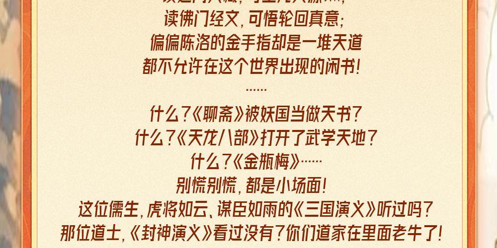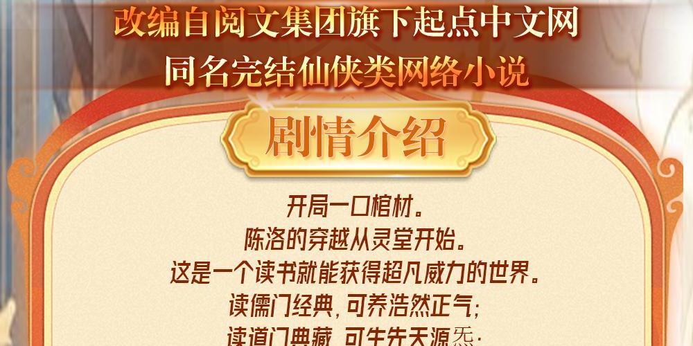 开局一口棺材。 陈洛的穿越从灵堂开始。 这是一个读书就能获得超凡威力的世界。 读儒门经典,可养浩然正气; 读道门典藏,可生先天源炁; 读佛门经文,可悟轮回真意; 偏偏陈洛的金手指却是一堆天道都不允许在这个世界出现的闲书! …… 什么?《聊斋》被妖国当作天书? 别慌别慌,都是小场面! 这位儒生,虎将如云、谋臣如雨的《三国演义》听过吗? 那位道士,《封神演义》看过没有?你们道家在里面老牛了! 哎,高僧请留步,我这里还有一本《西游记》,你感兴趣吗? …… 经史子集天上道,说书演义人间貌。 你炼阳神他修佛,红尘有我向天笑。