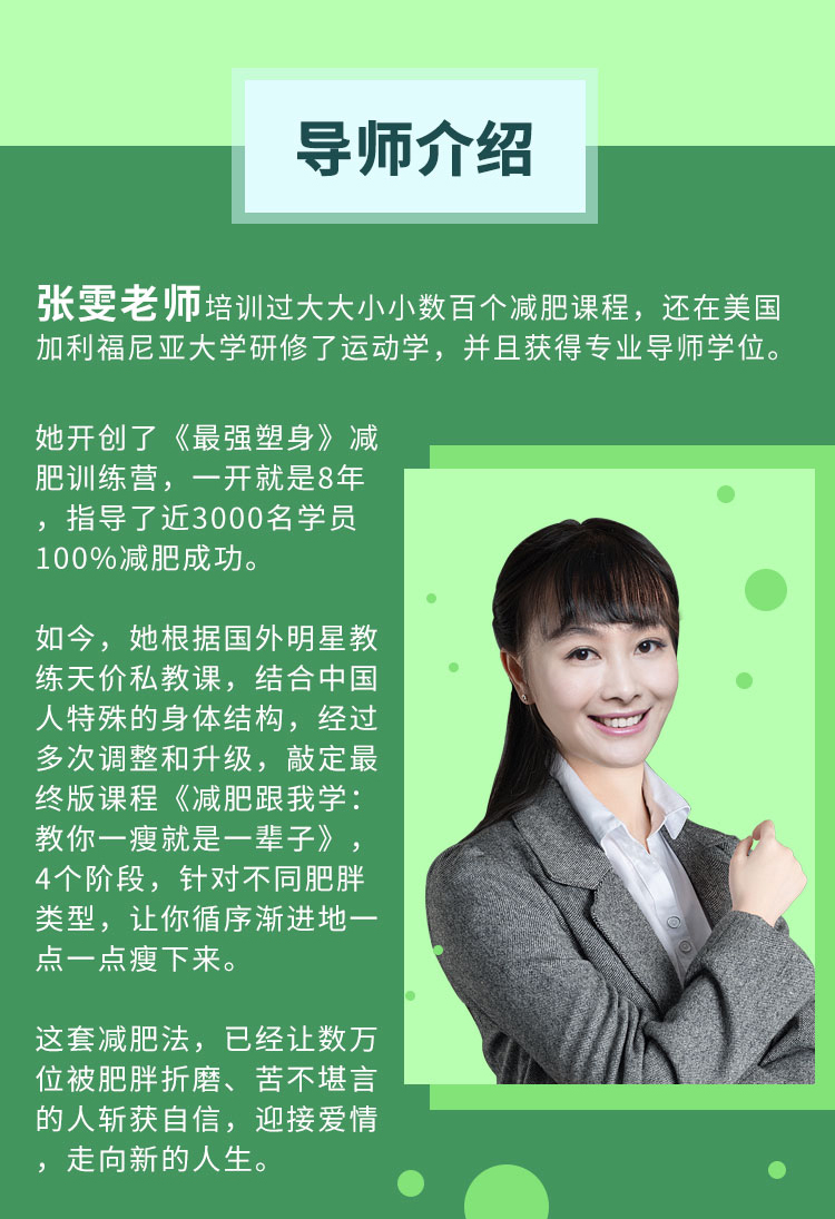培训过大大小小数百个减肥课程,还在美国加利福尼亚大学研修了运动学,并且获得专业导师学位。她开创了《最强塑身》减肥训练营,一开就是8年,指导了近3000名学员100%减肥成功。