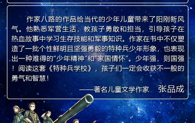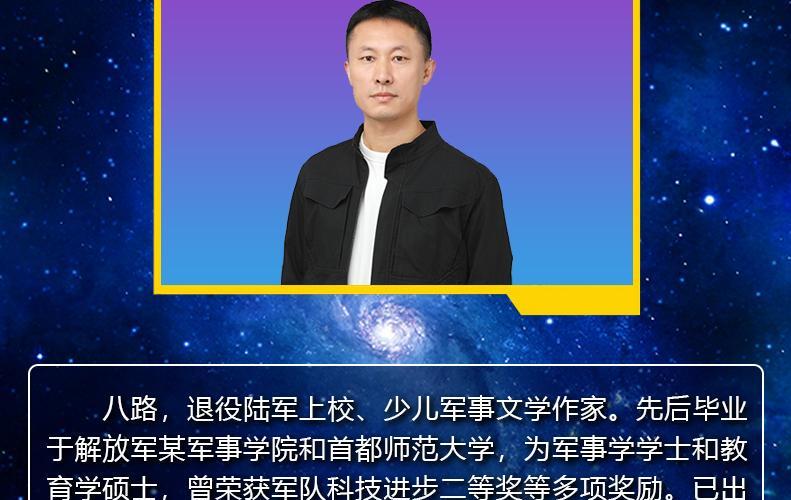 作家八路,军事学学士,教育学硕士,少儿军事文学领军人物,以“学会生存”的理念进行创作,将“知识、技能、品质”三大要素融入到作品之中。曾获军队科技进步二等奖等多项奖励,作品入选“十三五”国家重点出版物出版规划,作品有“特种兵学校”“少年特战队”“会飞的军校”“烈火兵王”等。
