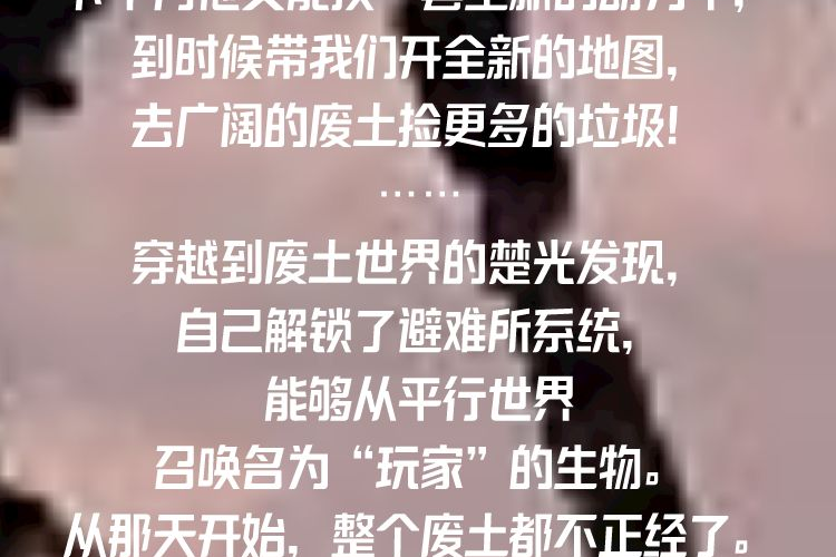 穿越到废土世界的楚光发现,自己解锁了避难所系统,能够从平行世界召唤名为“玩家”的生物。 从那天开始,整个废土都不正经了。