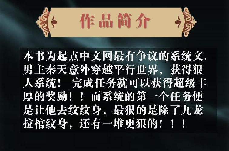 秦天意外穿越平行世界,获得狠人系统! 完成任务就可以获得超级丰厚的奖励!!而系统的第一个任务便是让他去纹纹身!!!