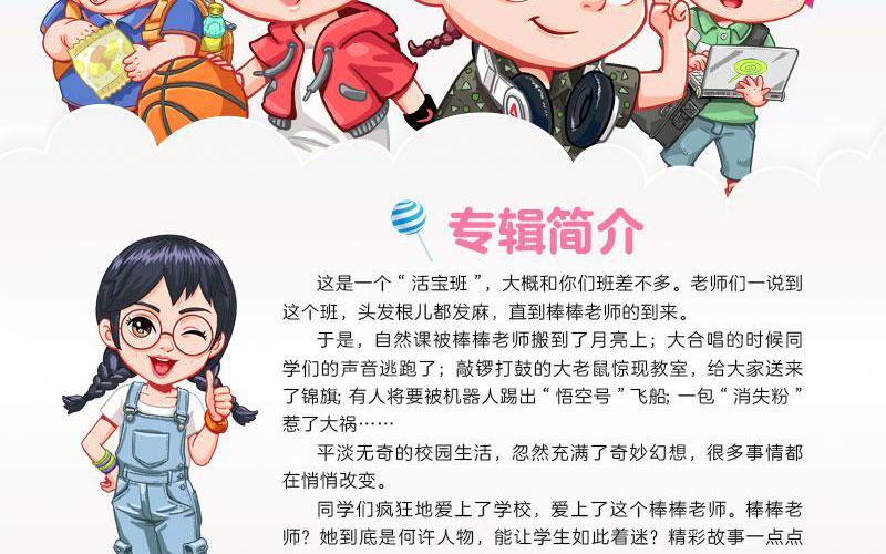 这是一个“活宝班”,大概和你们班差不多。老师们一说到这个班,头发根儿都发麻,直到棒棒老师的到来。于是,自然课被棒棒老师搬到了月亮上;大合唱的时候同学们的声音逃跑了;敲锣打鼓的大老鼠惊现教室,给大家送来了锦旗;有人将要被机器人踢出“悟空号“飞船;一包“消失粉”惹了大祸…… 平淡无奇的校园生活,忽然充满了奇妙幻想,很多事情都在悄悄改变。同学们疯狂地爱上了学校,爱上了这个棒棒老师。棒棒老师?她到底是何许人物,能让学生如此着迷?精彩故事一点点的带你去揭秘。