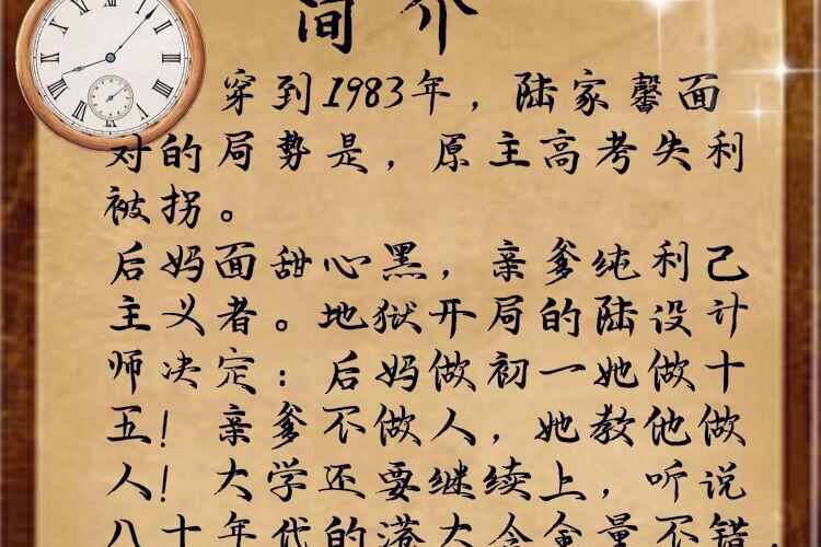 穿到1983年,陆家馨面对的开局是,原主高考失利被拐,后妈面甜心黑,亲爹纯利己主义者。地狱开局的陆设计师决定:后妈做初一,她做十五!亲爹不做人,她教他做人!大学还要继续上,听说八十年代的港大含金量不错,她挥挥衣袖,勇闯港圈金融圈。大哥大,哔哔机,舞池里的凌凌漆!太平山,浅水湾,维多利亚女大款!