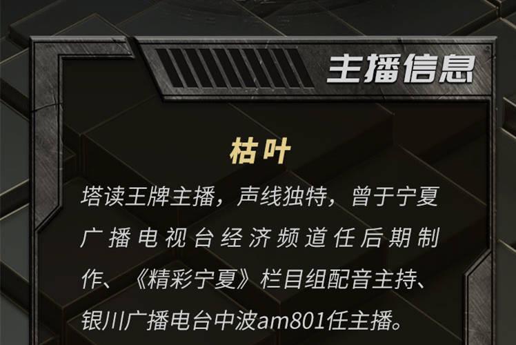 枯叶,塔读王牌主播,声线独特,曾于宁夏广播电视台经济频道任后期制作、《精彩宁夏》栏目组配音主持、银川广播电台中波am801任主播。