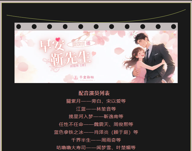 「每天早上醒来,第一眼看到的是最有权势的男人-自己的小舅舅,是什么体验?」 靳添集团总裁,冷酷无情、杀伐果断,心底却有一个不允许别人触碰的逆鳞。 访谈上,主持人问道:“靳二爷,请问您最喜欢什么?” “我老婆。” “……”主持人又问:“靳二爷,请问您每天回去怎么消遣时光?” “陪老婆。”某二爷回答得一本正经。 “……”主持人再问:“靳二爷,请问您除了喜欢您夫人以外,还喜欢什么?” “还是我老婆。”说完,某二爷抬起手腕看了看表,姿态优雅地站起:“抱歉,我得回家给我老婆准备晚饭了。” 主持人汗颜:“……”原来令人闻风丧胆的靳二爷,竟然是个宠妻狂魔! 她被冠上“靳太太”之名,成了全城艳羡又嫉妒的靶心。 他护她如命,宠她入骨,却藏着一场深埋十年的暗涌。 ——当柔软遇见强势,天真瓦解冰山—— 一段游走在阴谋与真心之间的顶级豪情悄然开启…… —清晨的第一声“早安”,是缠绵的吻,亦是颠覆命运的序章。 【热门IP改编·声临其境】 演播团队以沉浸式嗓音演绎靳逸南的霸总磁性&林笙音的倔强甜美, 带你闯入霸总步步为营的宠妻计划,聆听心跳加速的早安情话! 立即订阅,解锁成年人爱情里的极致浪漫与锋芒较量!
