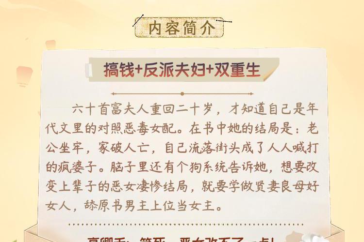 【搞钱+反派夫妇+双重生】六十首富夫人重回二十岁,才知道自己是年代文里的对照恶毒女配。在书中她的结局是:老公坐牢,家破人亡,自己流落街头成了人人喊打的疯婆子。 脑子里还有个狗系统告诉她,想要改变上辈子的恶女凄惨结局,就要学做贤妻良母好女人,舔原书男主上位当女主。 高卿禾:笑死,恶女改不了一点!