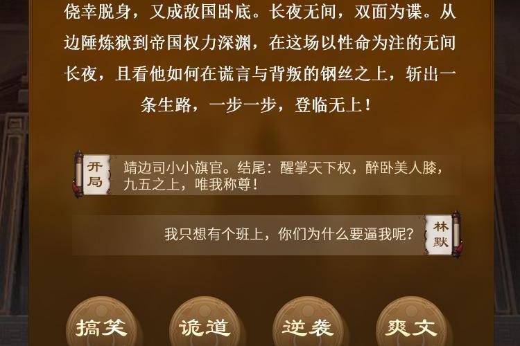 21世纪公务员穿越古代,成为雍国西南边陲的一个小旗官。炼狱醒来,已是叛国死囚。侥幸脱身,又成敌国卧底。长夜无间,双面为谍。从边陲炼狱到帝国权力深渊,在这场以性命为注的无间长夜,且看他如何在谎言与背叛的钢丝之上,斩出一条生路,一步一步,登临无上!林宣:我只想有个班上,你们为什么要逼我呢?