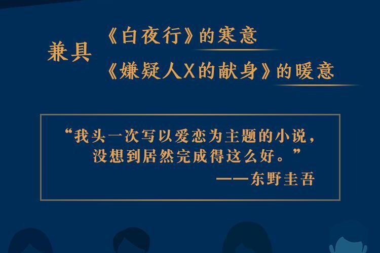 东野圭吾:“我头一次写以爱恋为主题的小说,没想到居然完成得这么好。” 兼具《白夜行》的寒意,《嫌疑人X的献身》般的暖意