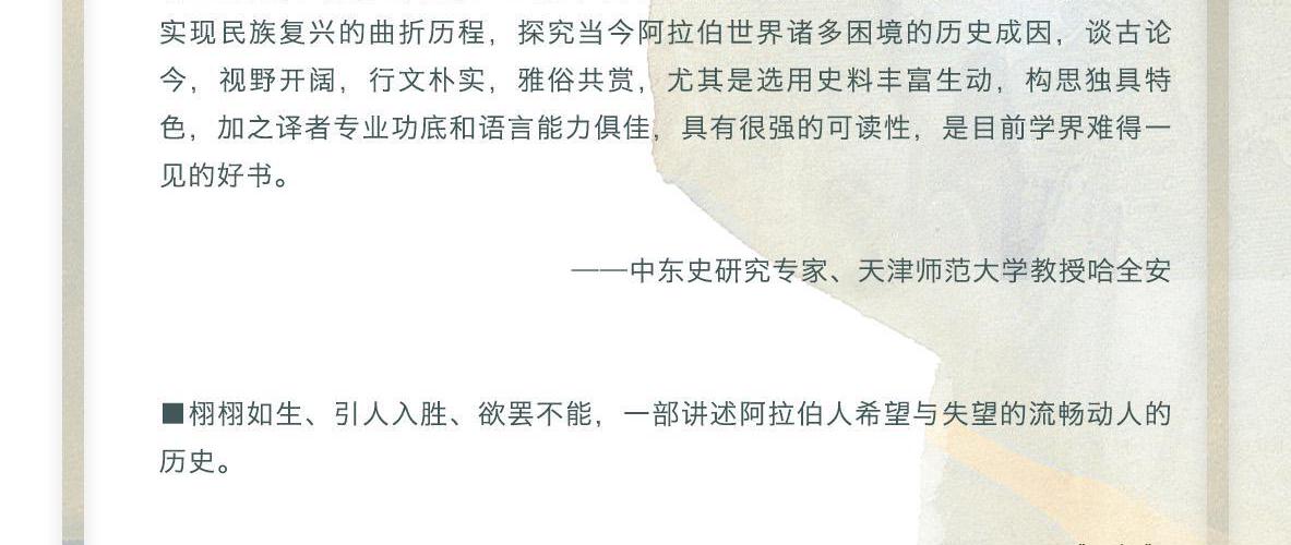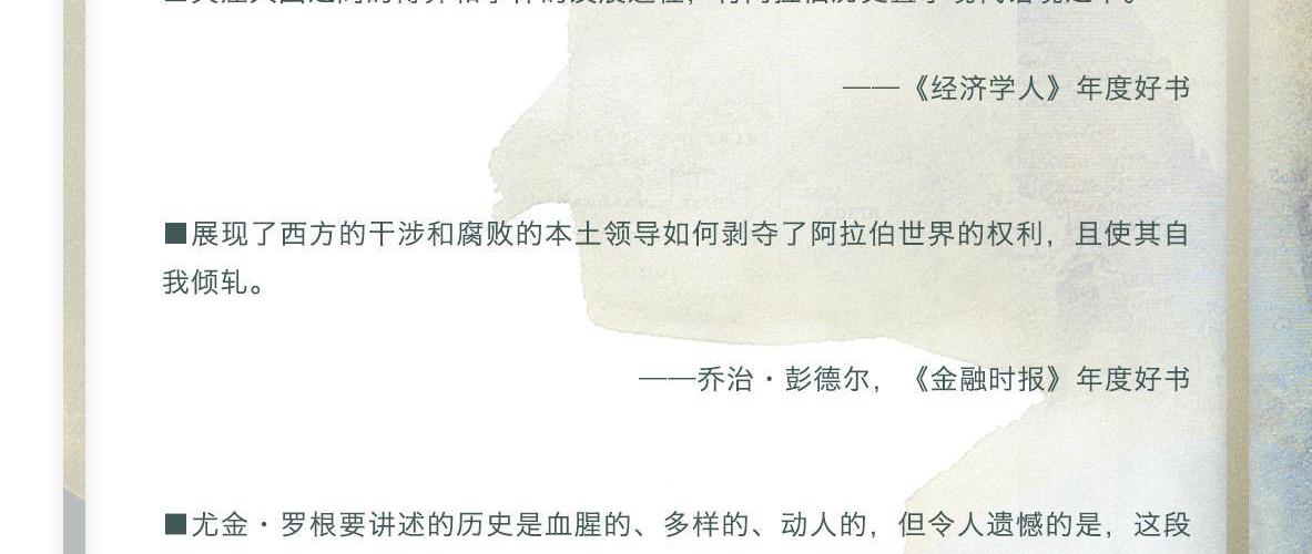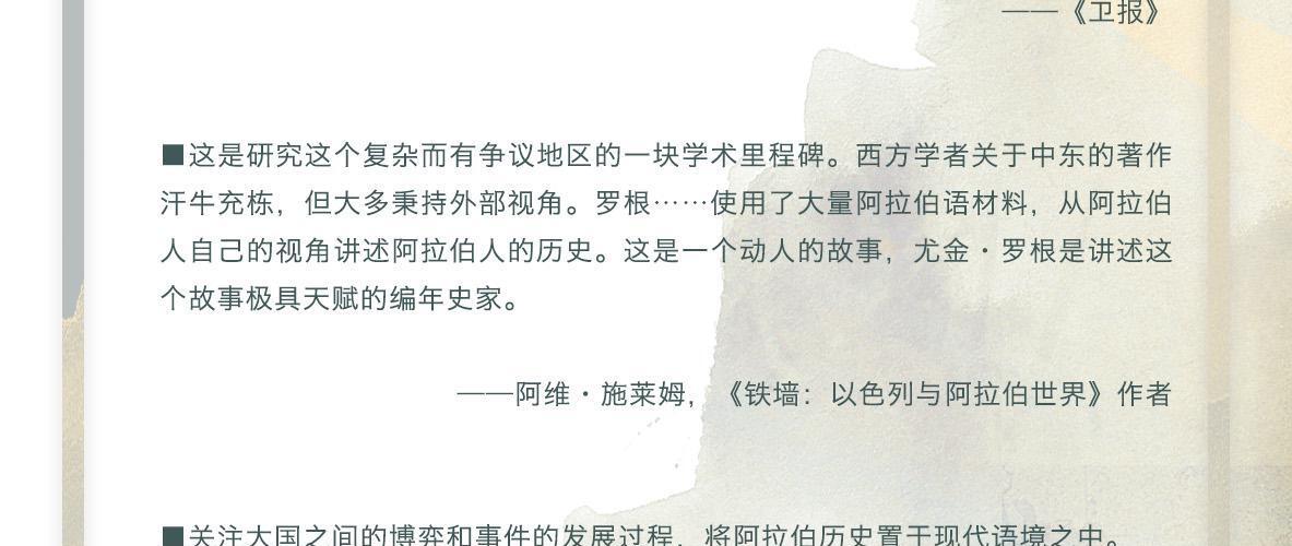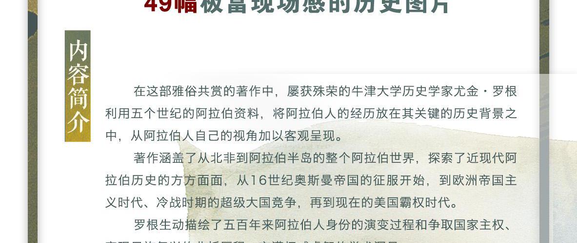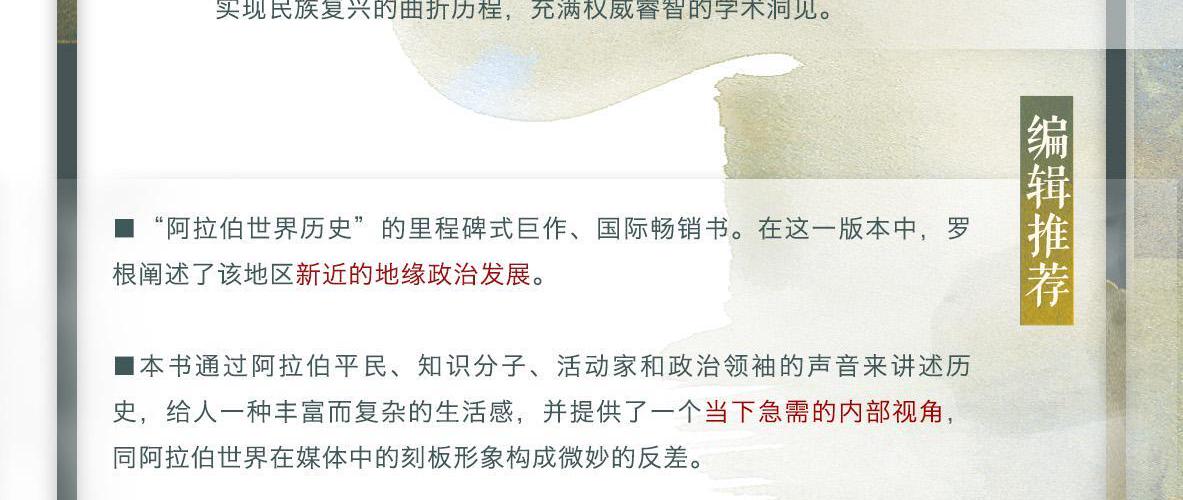 阿拉伯世界的历史是一个关于殖民、战争和抵抗的血腥的故事,也是一个充满创造力的多样、动人的故事。在这部开创性的雅俗共赏的著作中,屡获殊荣的牛津大学历史学家尤金•罗根广泛利用五个世纪的阿拉伯资料,将阿拉伯人的经历放在其关键的历史背景之中,从阿拉伯人自己的视角加以客观呈现。这本具有里程碑意义的著作涵盖了从北非到阿拉伯半岛的整个阿拉伯世界,探索了近现代阿拉伯历史的方方面面。从16世纪奥斯曼帝国的征服开始,到欧洲帝国主义时代、冷战时期的超级大国竞争,再到现在的美国霸权时代,罗根生动描绘了五百年来阿拉伯人身份的演变过程和争取国家主权、实现民族复兴的曲折历程,探究了当今阿拉伯世界诸多困境的历史成因,充满权威睿智的学术洞见。 在世界不少地方,阿拉伯民族的历史、文化和性格常被严重误解。对于任何想要清晰、高效、可靠了解近现代阿拉伯世界的人来说,本书是必不可少的选择。