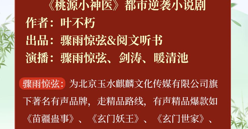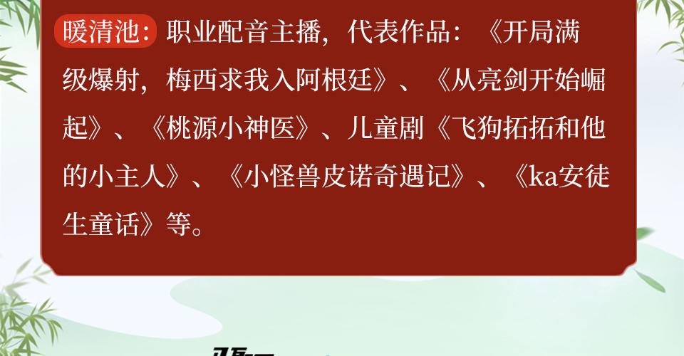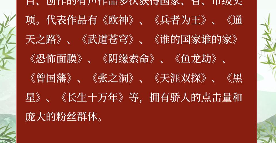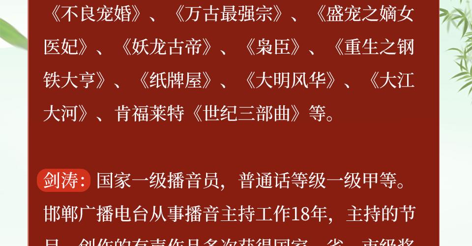 骤雨惊弦:为北京玉水麒麟文化传媒有限公司旗下著名有声品牌,走精品路线,有声精品爆款如《苗疆蛊事》、《玄门妖王》、《玄门世家》、《不良宠婚》、《万古最强宗》、《盛宠之嫡女医妃》、《妖龙古帝》、《枭臣》、《重生之钢铁大亨》、《纸牌屋》、《大明风华》、《大江大河》、肯福莱特《世纪三部曲》等。 剑涛,国家一级播音员,普通话等级一级甲等。邯郸广播电台从事播音主持工作18年,主持的节目、创作的有声作品多次获得国家、省、市级奖项。代表作品有《欧神》、《兵者为王》、《通天之路》、《武道苍穹》、《谁的国家谁的家》《恐怖面膜》、《阴缘索命》、《鱼龙劫》、《曾国藩》、《张之洞》、《天涯双探》、《黑星》、《长生十万年》等,拥有骄人的点击量和庞大的粉丝群体。 暖清池:职业配音主播,代表作品:《开局满级爆射,梅西求我入阿根廷》、《从亮剑开始崛起》、《桃源小神医》、儿童剧《飞狗拓拓和他的小主人》、《小怪兽皮诺奇遇记》、《ka安徒生童话》等。