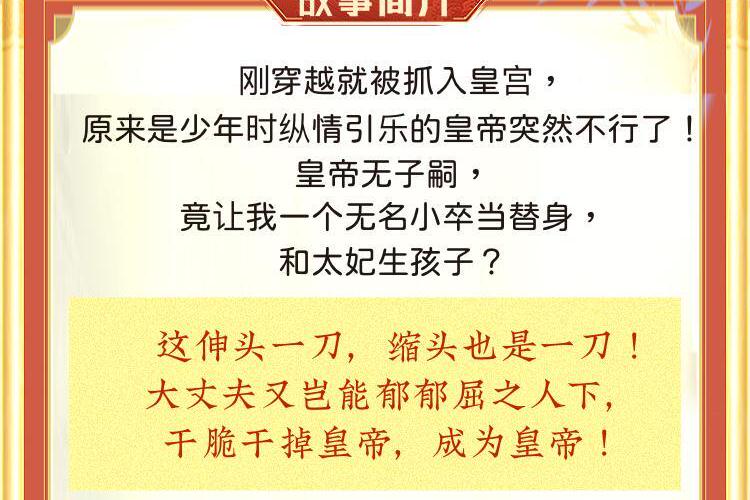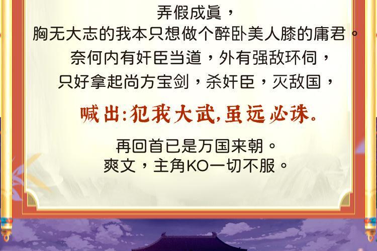 【昏君美女+爆笑穿越+权谋腹黑+杀伐果断+拌诸吃虎】刚穿越就被抓入皇宫,原来是少年时纵情引乐的皇帝突然不行了! 皇帝无子嗣,竟让我一个无名小卒当替身,和太妃生孩子? 这伸头一刀,缩头也是一刀!大丈夫又岂能郁郁屈之人下,干脆干掉皇帝,成为皇帝! 弄假成真,胸无大志的我本只想做个醉卧美人膝的庸君。 奈何内有奸臣当道,外有强敌环伺,只好拿起尚方宝剑,杀奸臣,灭敌国,喊出:犯我大武,虽远必诛。 再回首已是万国来朝。 爽文,主角KO一切不服。